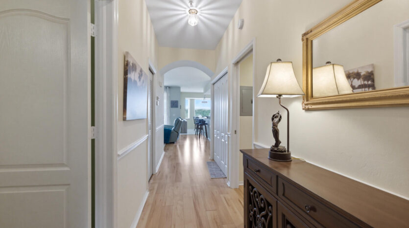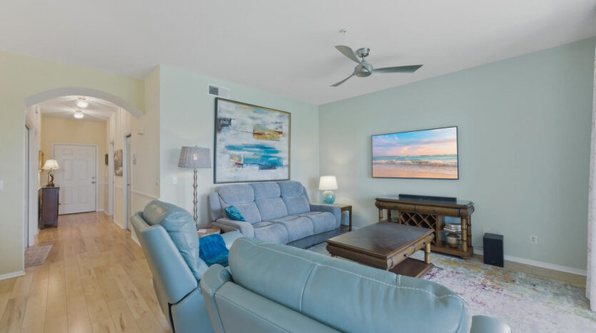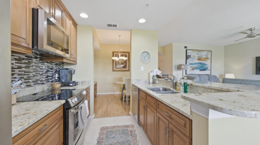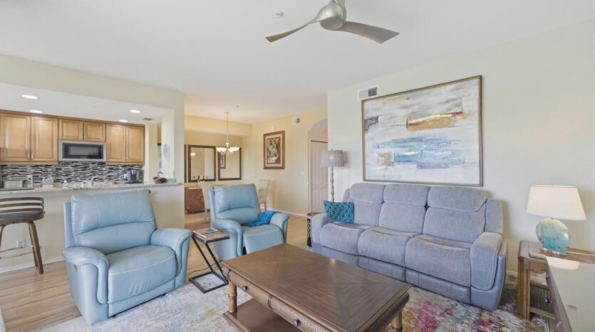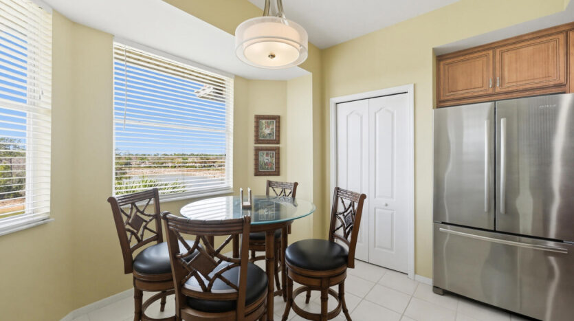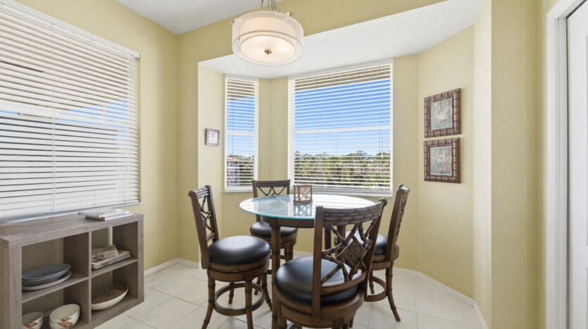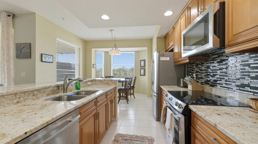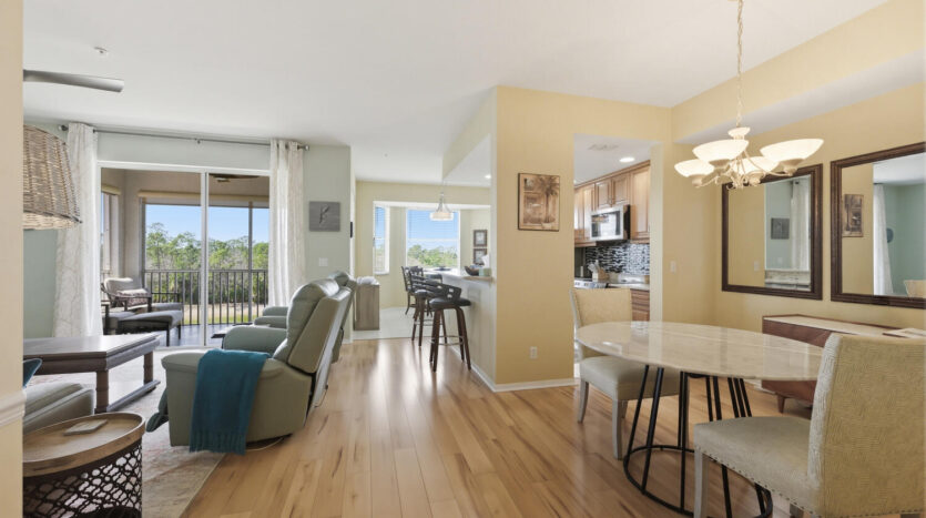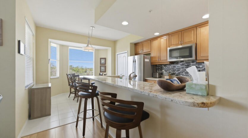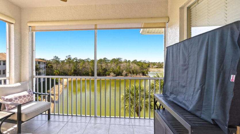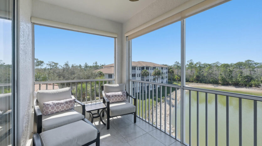 Fabulous top floor end unit popular open concept Brookside model completely furnished and ready to move into immediately at an incredible price. This condo has it all! From the moment you enter you will be impressed with the layout and views from the living areas. You will love the upgraded kitchen with granite counters and hardwood cabinetry with soft-close drawers along with Jenn-Aire stainless steel kitchen appliances. Upgraded primary and guest bathrooms with granite counters and hardwood cabinetry with soft-close drawers. New porcelain tile shower in primary bathroom. New ceiling fans in living room and lanai with remote controls. New light fixtures in main hallway, breakfast area and primary bathroom. Newer washer and dryer. Custom shade screens on lanai. The condo even comes with an extra large end unit storage room and includes full-size fridge/freezer and heavy-duty steel shelving. The view of the lake and preserve will win any discernible buyer over in a quiet serene location. The golden hour sunsets from the lanai are breathtaking. All this and so close to downtown Naples with its beautiful beaches, shopping and entertainment. Naples Heritage has it all championship golf, fitness center with classes, clubhouse with restaurant indoor outdoor dining, resort style pool with dining and bar area, tennis complex, pickleball complex, and even a bocce ball complex being completed in 2026. Come see what they’re all talking about in one of Naples premier bundled golf and resort style communities fabulous Naples Heritage. You’ve earned this lifestyle and it’s time to live it well in this fabulous